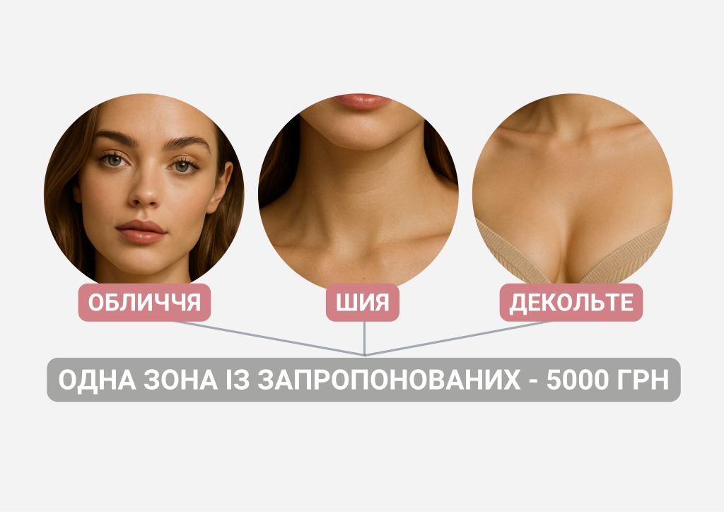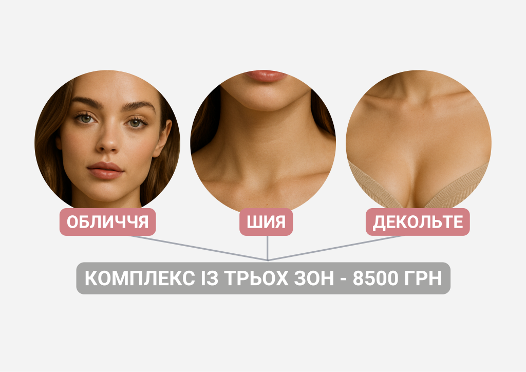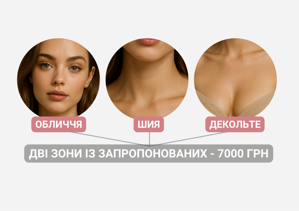 Мікроголковий RF -3 ділянки – спеціаліст проводить процедуру на усіх трьох зонах, ОБЛИЧЧЯ, ШИЯ, і ДЕКОЛЬТЕ.