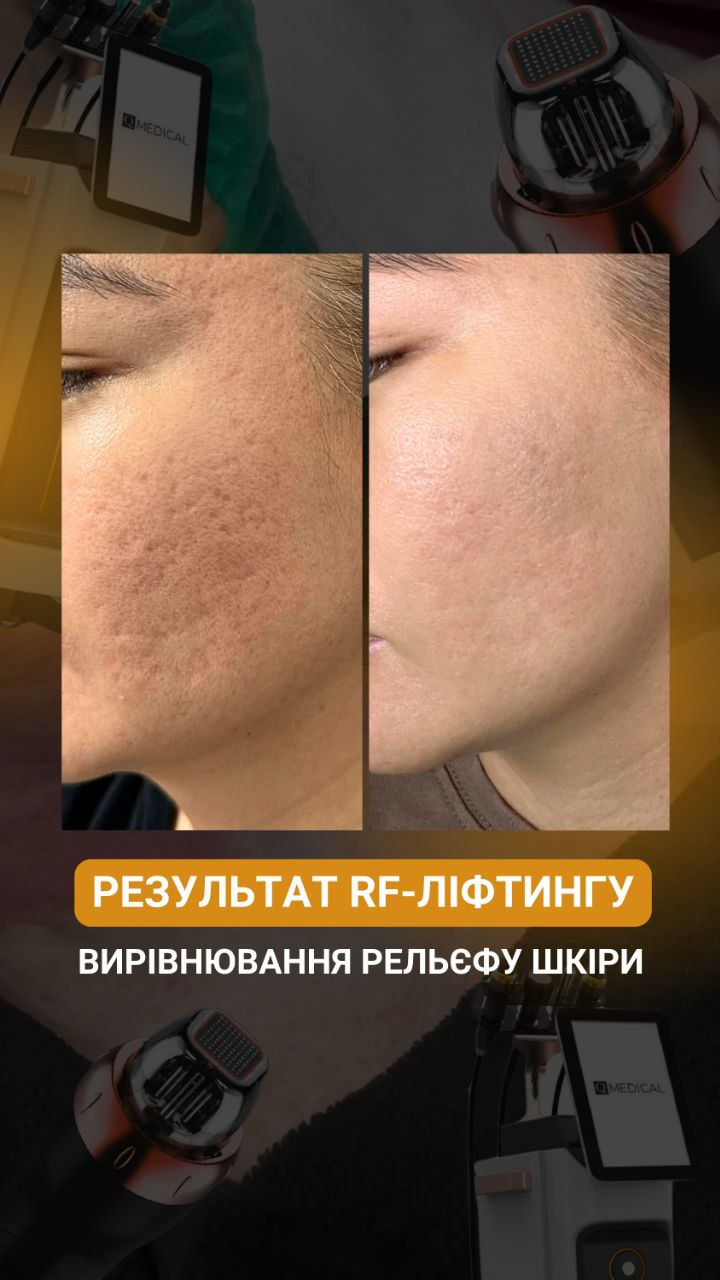 RF Ліфтинг здійснює лікування в’ялої шкіри, акне та рубців, а також для видалення глибоких зморшок, омолодження шкіри, відбілювання. Принцип дії – біологічнотермічний ефект.